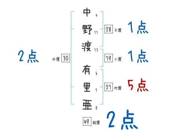 天運![]() | 中野渡有里亜さんの天運は28画の1つ星!家庭環境に注意。スポーツで活躍できる能力があるかも。 家系が持つ宿命的な運勢を表します。祖先から受け継いだ苗字ですので自分の力が及びません。家柄を象徴します。 |