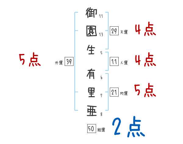 外運![]() | 御園生有里亜さんの外運は39画の5つ星!社交性に優れ人望が厚い。人の上に立ち成功する。 生活面を象徴する運勢です。外部から受ける影響力を表し、結婚運、家庭運や職場、環境への順応性を表します。 |