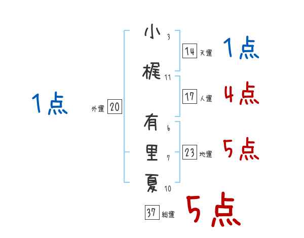 天運![]() | 小梶有里夏さんの天運は14画の1つ星!人に対して優しいがストレスを溜め込みがち。人間関係のトラブルを避けるよう気をつけましょう。 家系が持つ宿命的な運勢を表します。祖先から受け継いだ苗字ですので自分の力が及びません。家柄を象徴します。 |