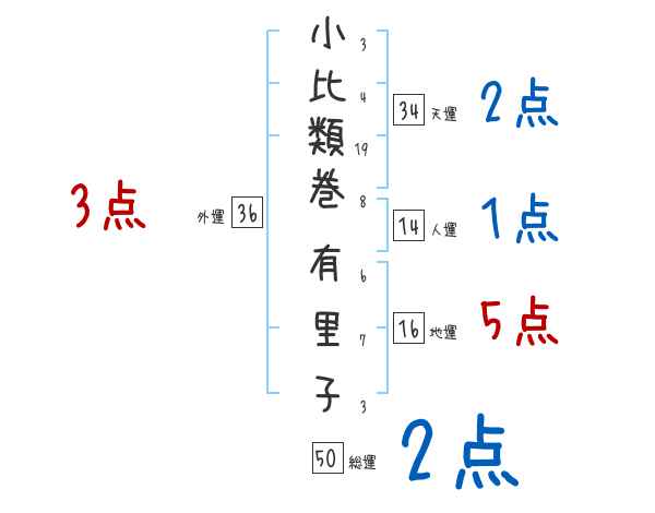 外運![]() | 小比類巻有里子さんの外運は36画の3つ星!先見性が豊かです。多少神経質で苦労することも。 生活面を象徴する運勢です。外部から受ける影響力を表し、結婚運、家庭運や職場、環境への順応性を表します。 |