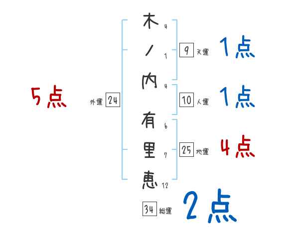 外運![]() | 木ノ内有里恵さんの外運は24画の5つ星!家庭運が良く順調な人生。金運にも恵まれる。 生活面を象徴する運勢です。外部から受ける影響力を表し、結婚運、家庭運や職場、環境への順応性を表します。 |
