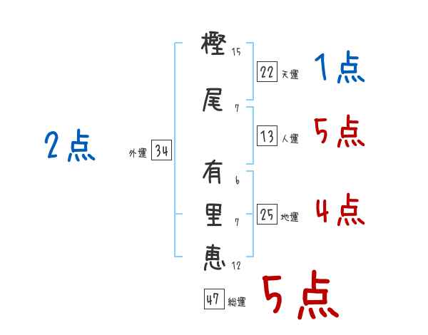 天運![]() | 樫尾有里恵さんの天運は22画の1つ星!努力することが苦手ないっぽう手先が器用。芸術性にも優れる。 家系が持つ宿命的な運勢を表します。祖先から受け継いだ苗字ですので自分の力が及びません。家柄を象徴します。 |