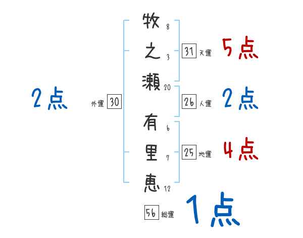総運![]() | 牧之瀬有里恵さんの総運は56画の1つ星!消極的で無気力になりがち。誠実な気持ちが必要でしょう。 あなたの人生を表す1番重要な運勢です。生涯を通じて影響する総合運となり、主に50歳以降の晩年期に影響を及ぼします。 |