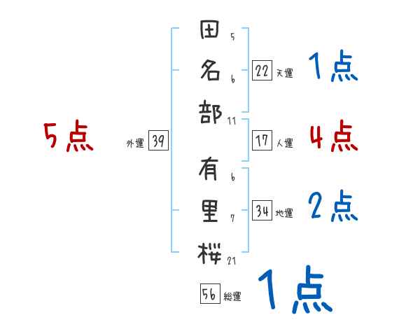 総運![]() | 田名部有里桜さんの総運は56画の1つ星!消極的で無気力になりがち。誠実な気持ちが必要でしょう。 あなたの人生を表す1番重要な運勢です。生涯を通じて影響する総合運となり、主に50歳以降の晩年期に影響を及ぼします。 |