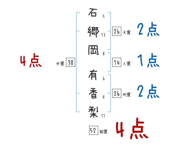 天運![]() | 石郷岡有香梨さんの天運は26画の2つ星!波瀾万丈かも。信頼できる人を大事にしましょう。 家系が持つ宿命的な運勢を表します。祖先から受け継いだ苗字ですので自分の力が及びません。家柄を象徴します。 |