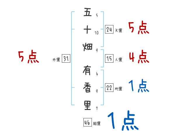 天運![]() | 五十畑有香里さんの天運は24画の5つ星!家庭運が良く順調な人生。金運にも恵まれる。 家系が持つ宿命的な運勢を表します。祖先から受け継いだ苗字ですので自分の力が及びません。家柄を象徴します。 |