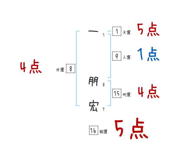 天運![]() | 一朋宏さんの天運は1画の5つ星!行動力、指導力があり出世し繁栄する。幸運に恵まれる。 家系が持つ宿命的な運勢を表します。祖先から受け継いだ苗字ですので自分の力が及びません。家柄を象徴します。 |