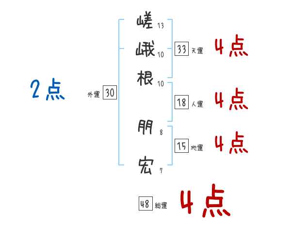 天運![]() | 嵯峨根朋宏さんの天運は33画の4つ星!権力志向でプライドが高い。勇気があり運を切り開き成功する。 家系が持つ宿命的な運勢を表します。祖先から受け継いだ苗字ですので自分の力が及びません。家柄を象徴します。 |