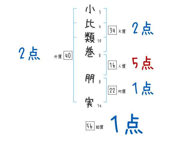外運![]() | 小比類巻朋実さんの外運は40画の2つ星!自信過剰で物事に固執するためトラブルに注意。 生活面を象徴する運勢です。外部から受ける影響力を表し、結婚運、家庭運や職場、環境への順応性を表します。 |