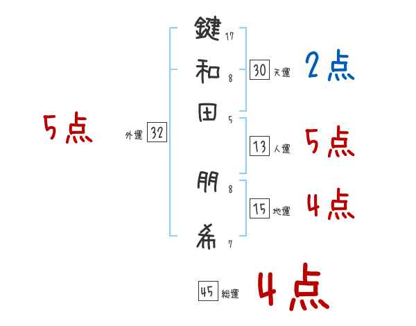 外運![]() | 鍵和田朋希さんの外運は32画の5つ星!柔軟性があり成功する。チャンスが多く金運が良い。 生活面を象徴する運勢です。外部から受ける影響力を表し、結婚運、家庭運や職場、環境への順応性を表します。 |