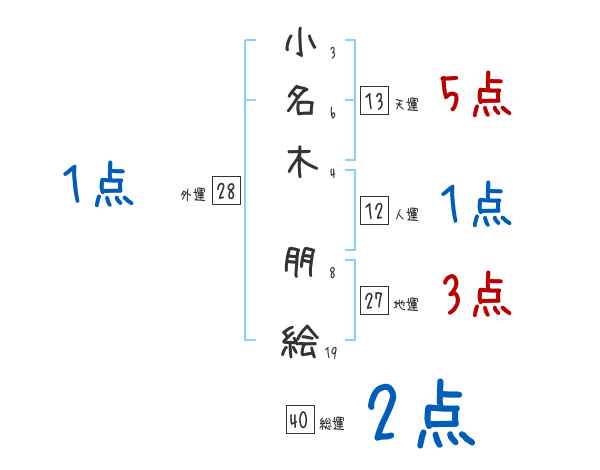 外運![]() | 小名木朋絵さんの外運は28画の1つ星!家庭環境に注意。スポーツで活躍できる能力があるかも。 生活面を象徴する運勢です。外部から受ける影響力を表し、結婚運、家庭運や職場、環境への順応性を表します。 |