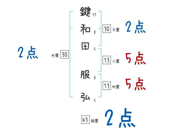 天運![]() | 鍵和田服弘さんの天運は30画の2つ星!浮き沈みの激しさに注意しましょう。 家系が持つ宿命的な運勢を表します。祖先から受け継いだ苗字ですので自分の力が及びません。家柄を象徴します。 |