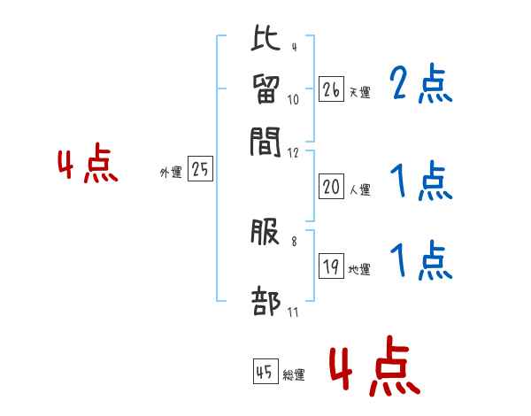総運![]() | 比留間服部さんの総運は45画の4つ星!もくもくと物事を進め達成する。地味な努力家。 あなたの人生を表す1番重要な運勢です。生涯を通じて影響する総合運となり、主に50歳以降の晩年期に影響を及ぼします。 |
