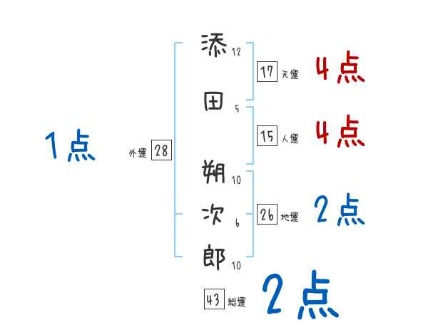 | 天運  | 添田朔次郎さんの天運は17画の4つ星!積極的な行動力。地位を気づき財産を手に入れる。純粋な心と直感力。家系が持つ宿命的な運勢を表します。祖先から受け継いだ苗字ですので自分の力が及びません。家柄を象徴します。 |