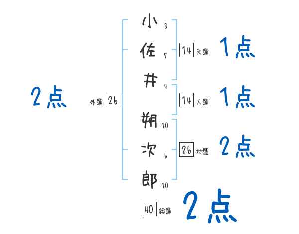 外運![]() | 小佐井朔次郎さんの外運は26画の2つ星!波瀾万丈かも。信頼できる人を大事にしましょう。 生活面を象徴する運勢です。外部から受ける影響力を表し、結婚運、家庭運や職場、環境への順応性を表します。 |