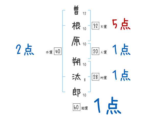 天運![]() | 曽根原朔汰郎さんの天運は32画の5つ星!柔軟性があり成功する。チャンスが多く金運が良い。 家系が持つ宿命的な運勢を表します。祖先から受け継いだ苗字ですので自分の力が及びません。家柄を象徴します。 |