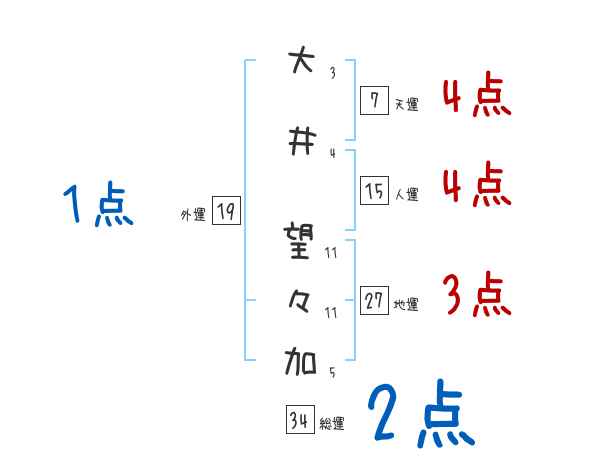 総運![]() | 大井望々加さんの総運は34画の2つ星!独創性に優れるが、自尊心が強く災難に注意しましょう。 あなたの人生を表す1番重要な運勢です。生涯を通じて影響する総合運となり、主に50歳以降の晩年期に影響を及ぼします。 |