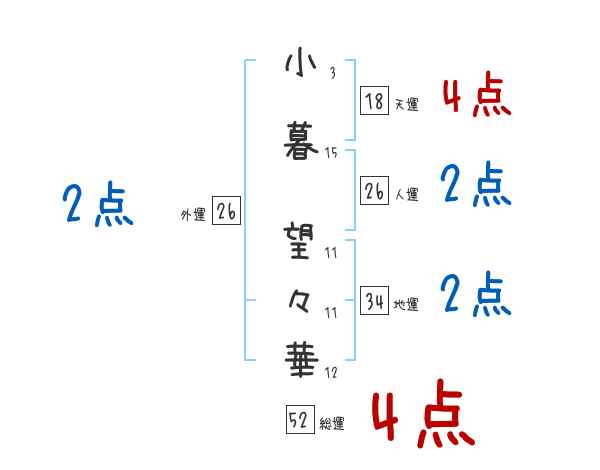 外運![]() | 小暮望々華さんの外運は26画の2つ星!波瀾万丈かも。信頼できる人を大事にしましょう。 生活面を象徴する運勢です。外部から受ける影響力を表し、結婚運、家庭運や職場、環境への順応性を表します。 |