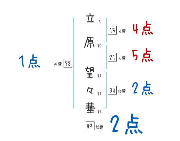 外運![]() | 立原望々華さんの外運は28画の1つ星!家庭環境に注意。スポーツで活躍できる能力があるかも。 生活面を象徴する運勢です。外部から受ける影響力を表し、結婚運、家庭運や職場、環境への順応性を表します。 |