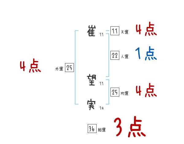 天運![]() | 崔望実さんの天運は11画の4つ星!着実に富や地位を得る幸運な人生。 家系が持つ宿命的な運勢を表します。祖先から受け継いだ苗字ですので自分の力が及びません。家柄を象徴します。 |