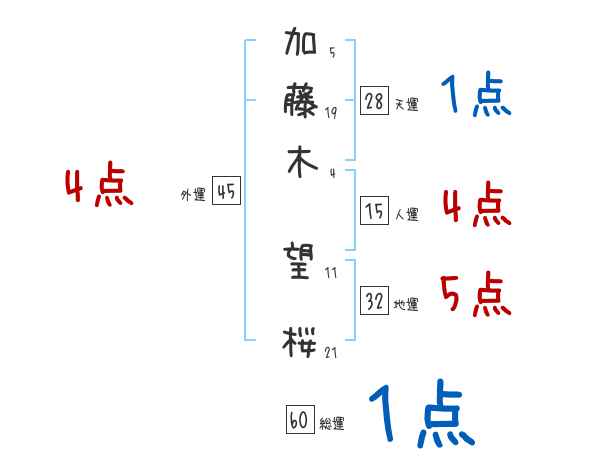 外運![]() | 加藤木望桜さんの外運は45画の4つ星!もくもくと物事を進め達成する。地味な努力家。 生活面を象徴する運勢です。外部から受ける影響力を表し、結婚運、家庭運や職場、環境への順応性を表します。 |