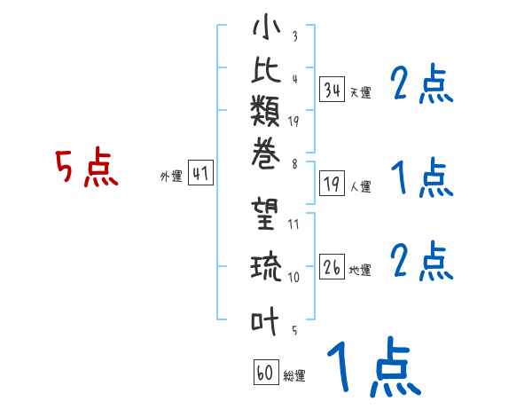 人運![]() | 小比類巻望琉叶さんの人運は19画の1つ星!優れた才能を持ちますが、協調性が足りないことも。周りの人と協力する事を意識しましょう。 性格や才能などを表す2番目に重要な運勢です。人間関係や協調性、社会的な成功に影響します。主に20歳から50歳ぐらいまでの中年期の運勢を表します。 |