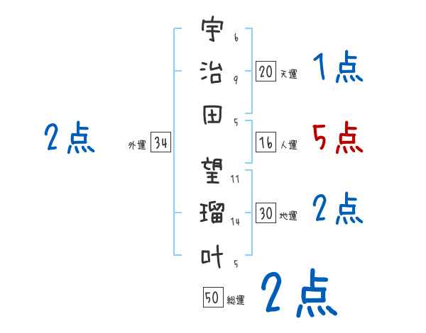 総運![]() | 宇治田望瑠叶さんの総運は50画の2つ星!浮き沈みが激しく不安定。しりすぼみに衰退しやすいので注意しましょう。 あなたの人生を表す1番重要な運勢です。生涯を通じて影響する総合運となり、主に50歳以降の晩年期に影響を及ぼします。 |