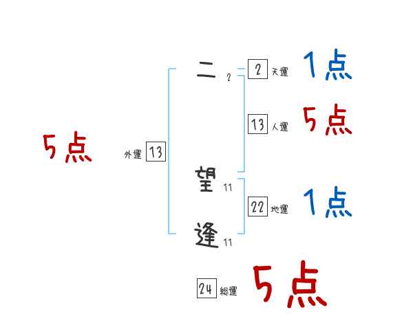 外運![]() | 二望逢さんの外運は13画の5つ星!才能に恵まれ人気がある。名声を手に入れる。円満な人生。 生活面を象徴する運勢です。外部から受ける影響力を表し、結婚運、家庭運や職場、環境への順応性を表します。 |
