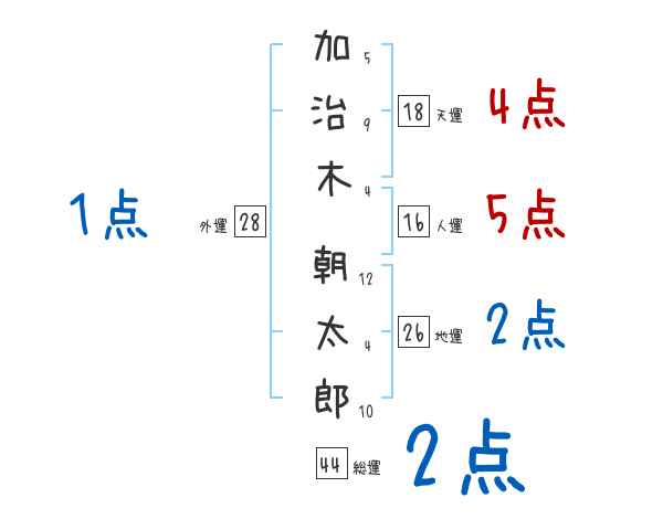人運![]() | 加治木朝太郎さんの人運は16画の5つ星!人望が厚く大きく発展する。逆転成功が見える。 性格や才能などを表す2番目に重要な運勢です。人間関係や協調性、社会的な成功に影響します。主に20歳から50歳ぐらいまでの中年期の運勢を表します。 |