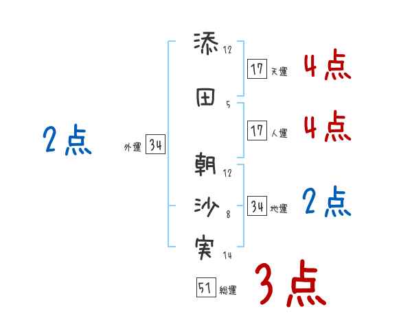 総運![]() | 添田朝沙実さんの総運は51画の3つ星!変化が激しく、危険に注意。堅実な性格。 あなたの人生を表す1番重要な運勢です。生涯を通じて影響する総合運となり、主に50歳以降の晩年期に影響を及ぼします。 |