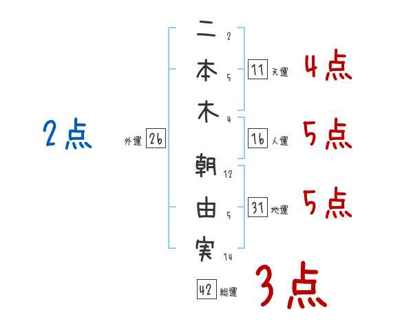 人運![]() | 二本木朝由実さんの人運は16画の5つ星!人望が厚く大きく発展する。逆転成功が見える。 性格や才能などを表す2番目に重要な運勢です。人間関係や協調性、社会的な成功に影響します。主に20歳から50歳ぐらいまでの中年期の運勢を表します。 |