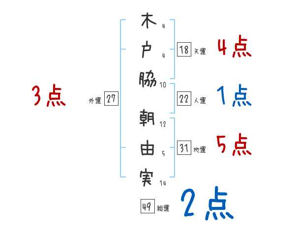 外運![]() | 木戸脇朝由実さんの外運は27画の3つ星!頭脳明晰だが強情で摩擦が多い傾向。孤立に注意。 生活面を象徴する運勢です。外部から受ける影響力を表し、結婚運、家庭運や職場、環境への順応性を表します。 |