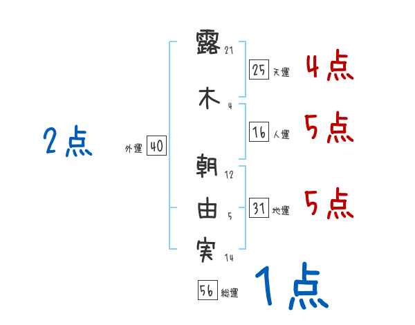 外運![]() | 露木朝由実さんの外運は40画の2つ星!自信過剰で物事に固執するためトラブルに注意。 生活面を象徴する運勢です。外部から受ける影響力を表し、結婚運、家庭運や職場、環境への順応性を表します。 |