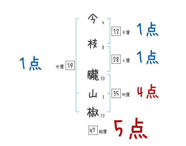 天運![]() | 今枝朧山椒さんの天運は12画の1つ星!簡単な失敗で諦めてしまいやすいかも。着実に行動すると良いでしょう。 家系が持つ宿命的な運勢を表します。祖先から受け継いだ苗字ですので自分の力が及びません。家柄を象徴します。 |