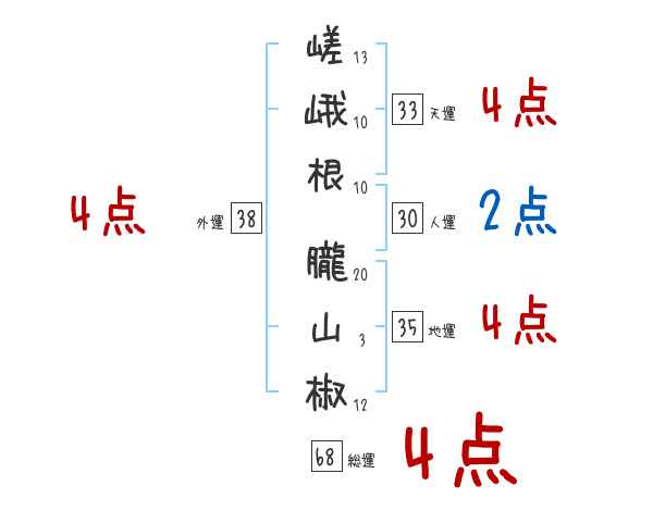 天運![]() | 嵯峨根朧山椒さんの天運は33画の4つ星!権力志向でプライドが高い。勇気があり運を切り開き成功する。 家系が持つ宿命的な運勢を表します。祖先から受け継いだ苗字ですので自分の力が及びません。家柄を象徴します。 |