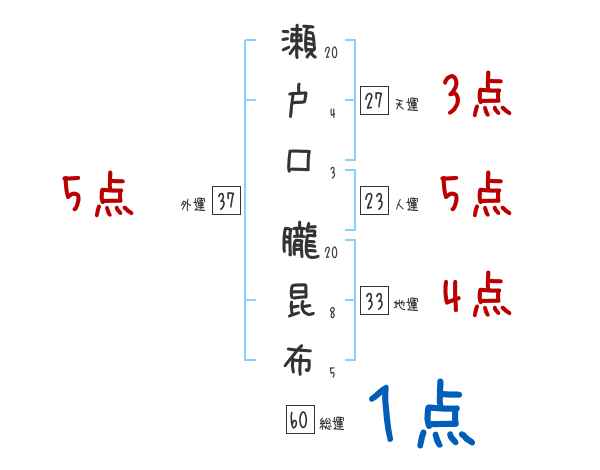 外運![]() | 瀬戸口朧昆布さんの外運は37画の5つ星!努力家で順応性に優れる。現実的な考え方ができ忠実に物事をこなす。 生活面を象徴する運勢です。外部から受ける影響力を表し、結婚運、家庭運や職場、環境への順応性を表します。 |