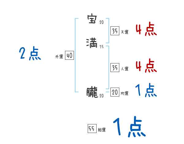 天運![]() | 宝満朧さんの天運は35画の4つ星!温厚な性格で感受性が高い。穏和な性格で人望が厚い。 家系が持つ宿命的な運勢を表します。祖先から受け継いだ苗字ですので自分の力が及びません。家柄を象徴します。 |