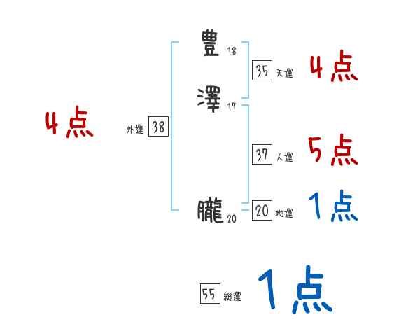 天運![]() | 豊澤朧さんの天運は35画の4つ星!温厚な性格で感受性が高い。穏和な性格で人望が厚い。 家系が持つ宿命的な運勢を表します。祖先から受け継いだ苗字ですので自分の力が及びません。家柄を象徴します。 |