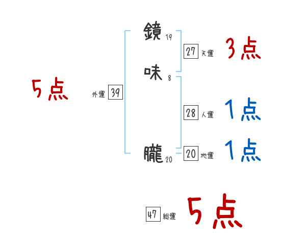 外運![]() | 鏡味朧さんの外運は39画の5つ星!社交性に優れ人望が厚い。人の上に立ち成功する。 生活面を象徴する運勢です。外部から受ける影響力を表し、結婚運、家庭運や職場、環境への順応性を表します。 |