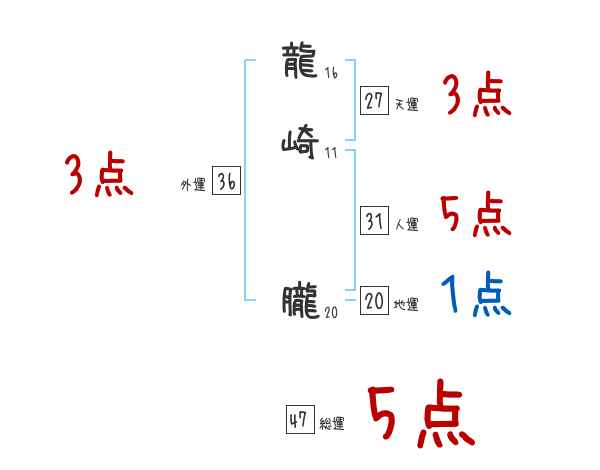 天運![]() | 龍崎朧さんの天運は27画の3つ星!頭脳明晰だが強情で摩擦が多い傾向。孤立に注意。 家系が持つ宿命的な運勢を表します。祖先から受け継いだ苗字ですので自分の力が及びません。家柄を象徴します。 |