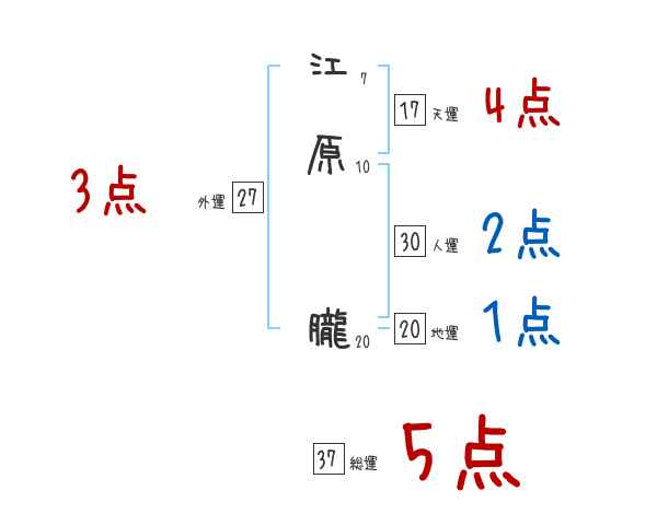 天運![]() | 江原朧さんの天運は17画の4つ星!積極的な行動力。地位を気づき財産を手に入れる。純粋な心と直感力。 家系が持つ宿命的な運勢を表します。祖先から受け継いだ苗字ですので自分の力が及びません。家柄を象徴します。 |