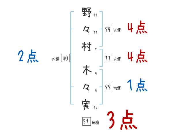 天運![]() | 野々村木々実さんの天運は29画の4つ星!完全主義で才能がある。厳格な心の持ち主。 家系が持つ宿命的な運勢を表します。祖先から受け継いだ苗字ですので自分の力が及びません。家柄を象徴します。 |