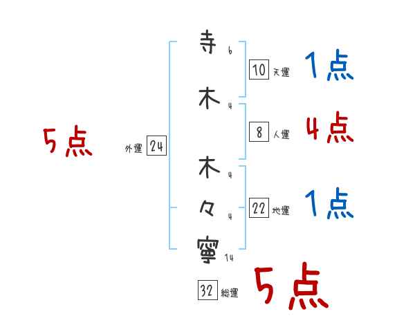 天運![]() | 寺木木々寧さんの天運は10画の1つ星!不安を感じやすい傾向。ストレスを抱えないように注意しましょう。 家系が持つ宿命的な運勢を表します。祖先から受け継いだ苗字ですので自分の力が及びません。家柄を象徴します。 |