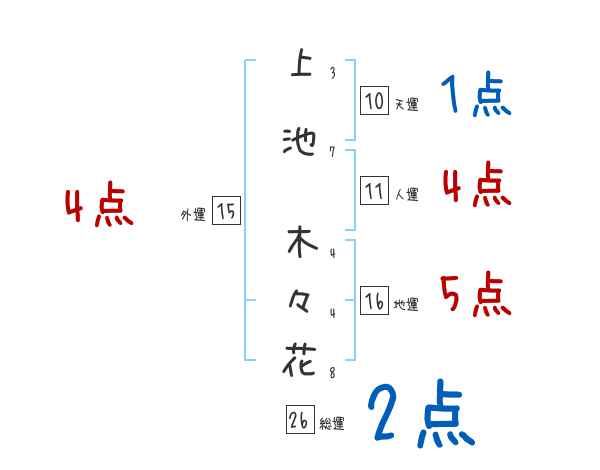 天運![]() | 上池木々花さんの天運は10画の1つ星!不安を感じやすい傾向。ストレスを抱えないように注意しましょう。 家系が持つ宿命的な運勢を表します。祖先から受け継いだ苗字ですので自分の力が及びません。家柄を象徴します。 |