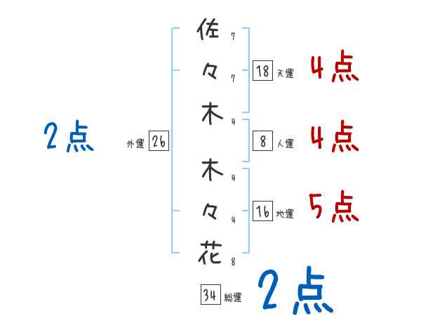 総運![]() | 佐々木木々花さんの総運は34画の2つ星!独創性に優れるが、自尊心が強く災難に注意しましょう。 あなたの人生を表す1番重要な運勢です。生涯を通じて影響する総合運となり、主に50歳以降の晩年期に影響を及ぼします。 |