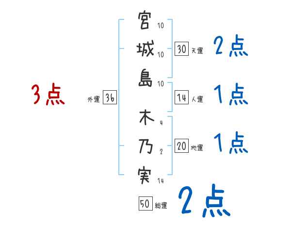 天運![]() | 宮城島木乃実さんの天運は30画の2つ星!浮き沈みの激しさに注意しましょう。 家系が持つ宿命的な運勢を表します。祖先から受け継いだ苗字ですので自分の力が及びません。家柄を象徴します。 |