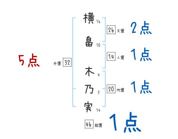 外運![]() | 横畠木乃実さんの外運は32画の5つ星!柔軟性があり成功する。チャンスが多く金運が良い。 生活面を象徴する運勢です。外部から受ける影響力を表し、結婚運、家庭運や職場、環境への順応性を表します。 |