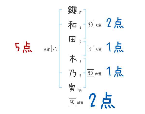 総運![]() | 鍵和田木乃実さんの総運は50画の2つ星!浮き沈みが激しく不安定。しりすぼみに衰退しやすいので注意しましょう。 あなたの人生を表す1番重要な運勢です。生涯を通じて影響する総合運となり、主に50歳以降の晩年期に影響を及ぼします。 |