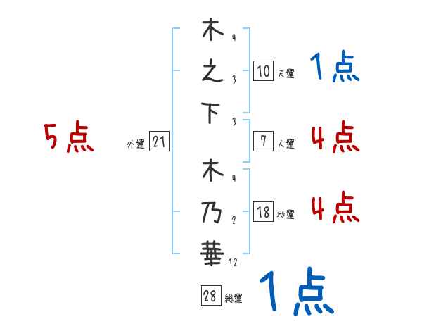 天運![]() | 木之下木乃華さんの天運は10画の1つ星!不安を感じやすい傾向。ストレスを抱えないように注意しましょう。 家系が持つ宿命的な運勢を表します。祖先から受け継いだ苗字ですので自分の力が及びません。家柄を象徴します。 |