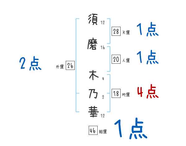 天運![]() | 須磨木乃華さんの天運は28画の1つ星!家庭環境に注意。スポーツで活躍できる能力があるかも。 家系が持つ宿命的な運勢を表します。祖先から受け継いだ苗字ですので自分の力が及びません。家柄を象徴します。 |